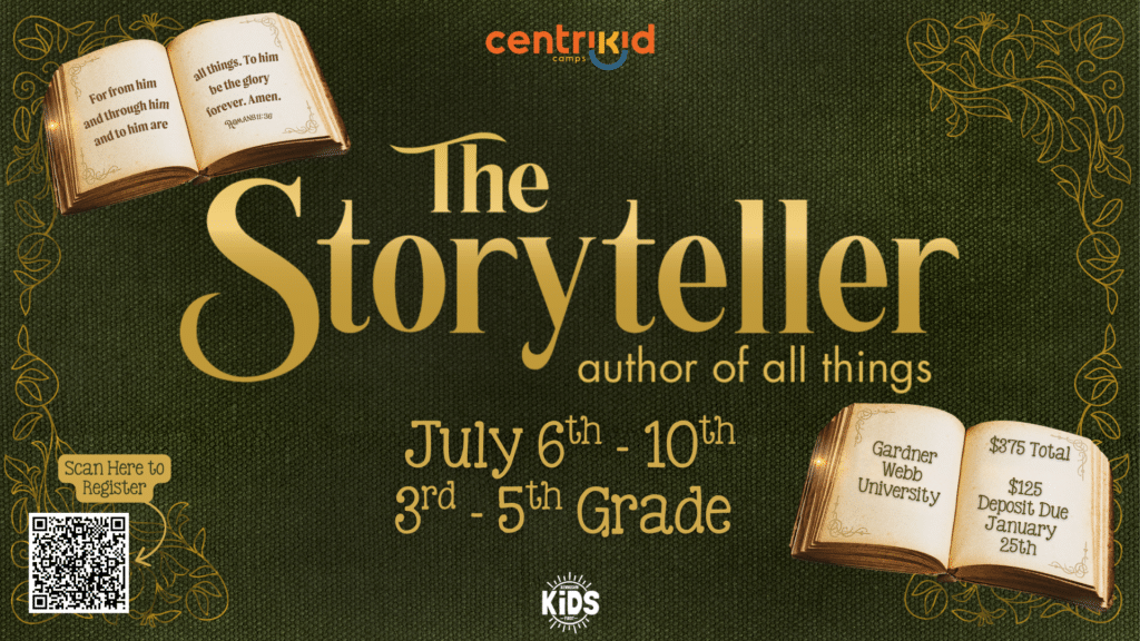 CentriKid Camp 2026: The Storyteller (July 6-10) invites kids into the truth that God is the Author of all things—and that their lives are part of His incredible story. Through worship, Bible study, and unforgettable fun, kids will grow in their faith, build friendships, and learn how God is working in and through them.