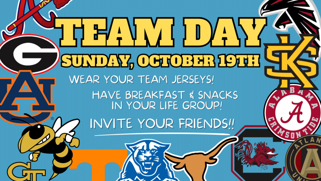Join us for Team Day on Sunday, October 19th. Everyone is encouraged to wear your team colors. Team Day is the perfect opportunity to invite a friend or neighbor to join you for lifegroup and worship!