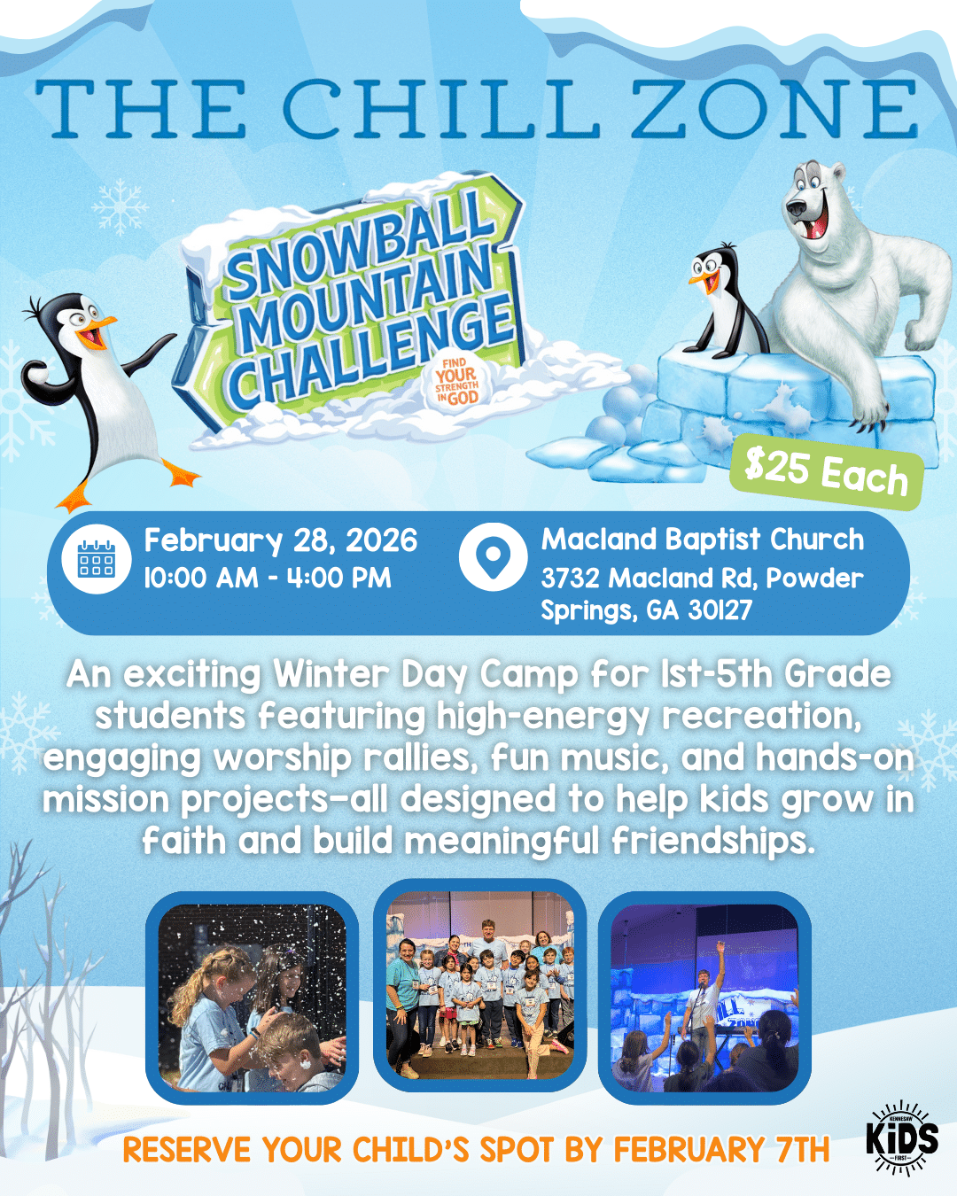 Join us Saturday, February 28 from 10:00 AM – 4:00 PM at Macland Baptist Church in Powder Springs, GA. This event is for 1st–5th Grade; cost is $25 per child.
