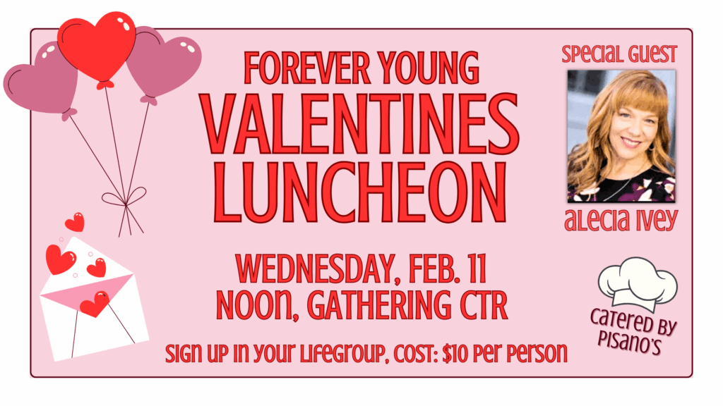 Join us for the “Forever Young Valentines Luncheon” on Wednesday, Feb. 11th at Noon in the Gathering Center. This year’s special guest is Alecia Ivey. Lunch will be catered by Pisano’s Catering. The menu will include pot roast w/ potatoes, carrots, onions & celery, house salad, rolls, and brownies or cobbler. The cost for this event is $10 per attendee.